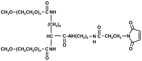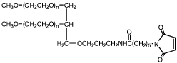 NOF provides 2-arm activated branched PEGs, as illustrated below. We offer these PEGs with a molecular weight of 20kDa, 40kDa, 60kDa and 80kDa. The available functional groups are amino, aldehyde, maleimide, NHS activated carbonate and NHS activated ester.