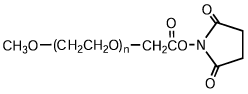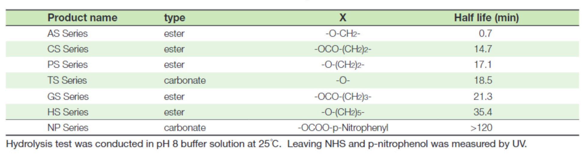 We supply six types of monomethoxy-NHS activated ester/carbonate-PEGs that differ in terms of the NHS carboxylate attachment chemistry. The reactivity order of these linkers in aqueous solution from lowest to highest is HS<GS<TS<PS<CS<AS. After PEGylation, CS and GS types possessing ester groups are relatively susceptible to hydrolysis, whereas AS, PS, TS and HS types are resistant to hydrolysis because of their different chemical structures. Therefore, our customers can select the appropriate type according to their goals among the six types available.