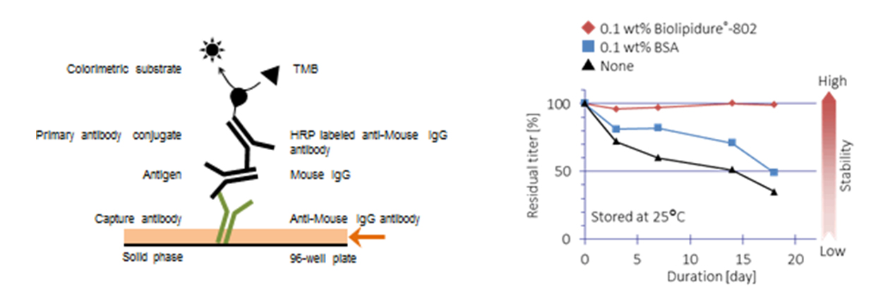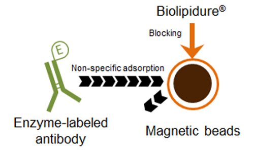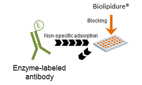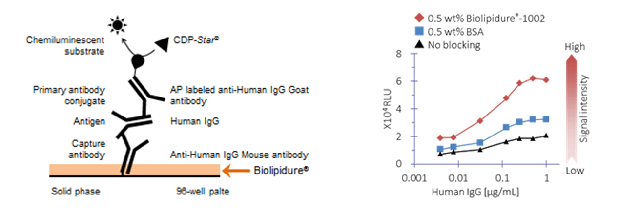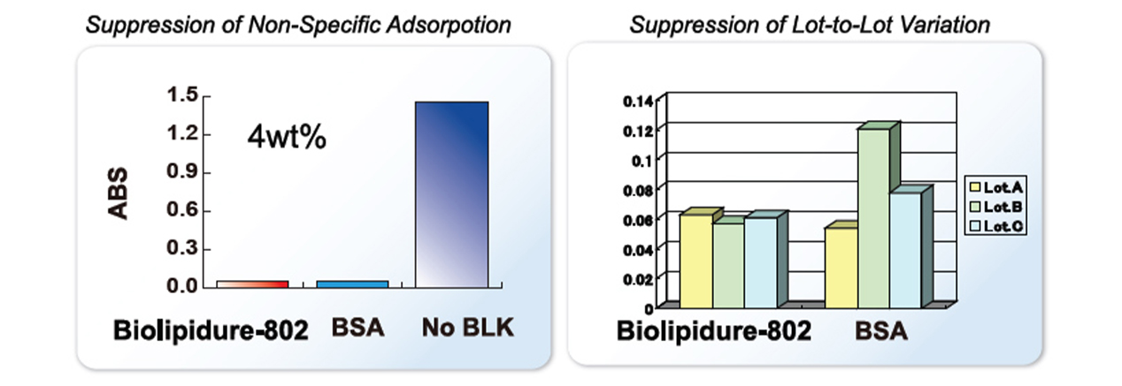 Biolipidure® has multiple functions such as suppression of non-specific adsorption of protein, stabilization of protein, and sensitization, all of which are required for developing diagnostic reagents. Biolipidure has variations with different molecular weights, hydrophilic-hydrophobic ratios, and ionic properties. You should test several to empirically determine which works best in your assay.