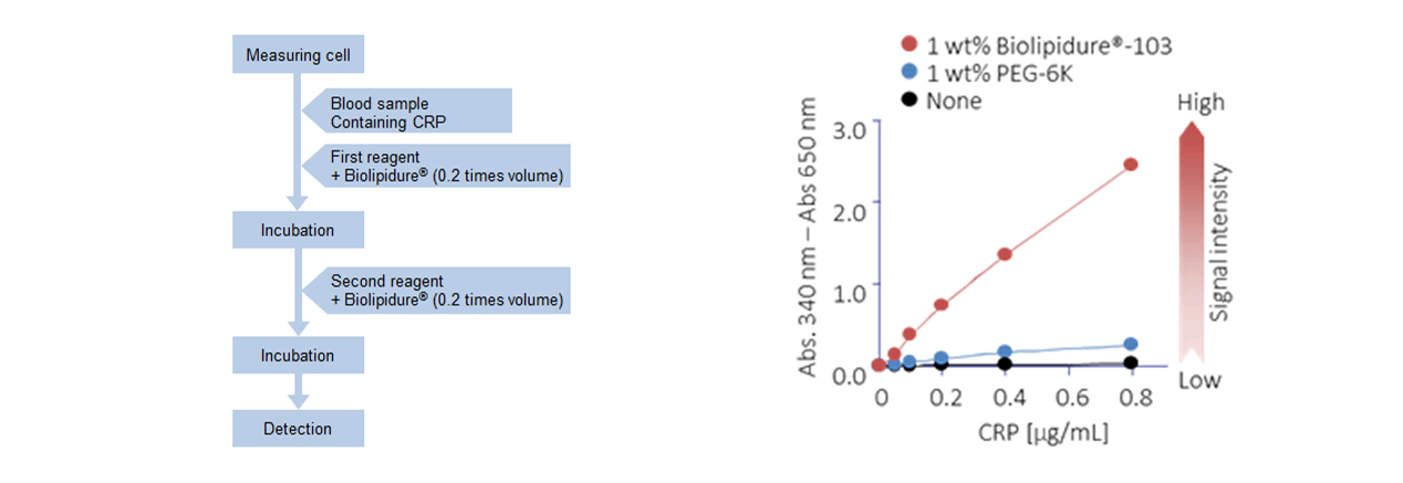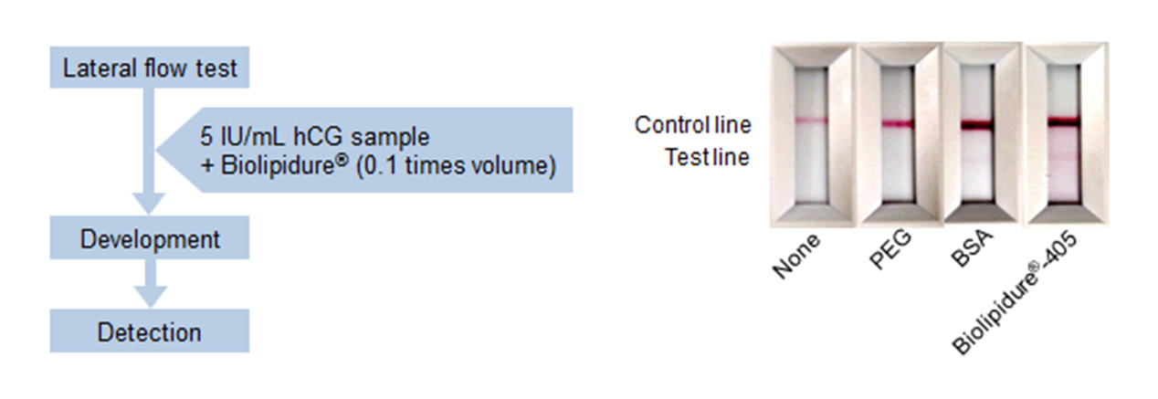 BIOLIPIDURE® exhibits sensitizing effect in immunoassay systems such as latex agglutination or immunochromatography, most likely caused by the improved dispersion of latex particle or gold colloid.